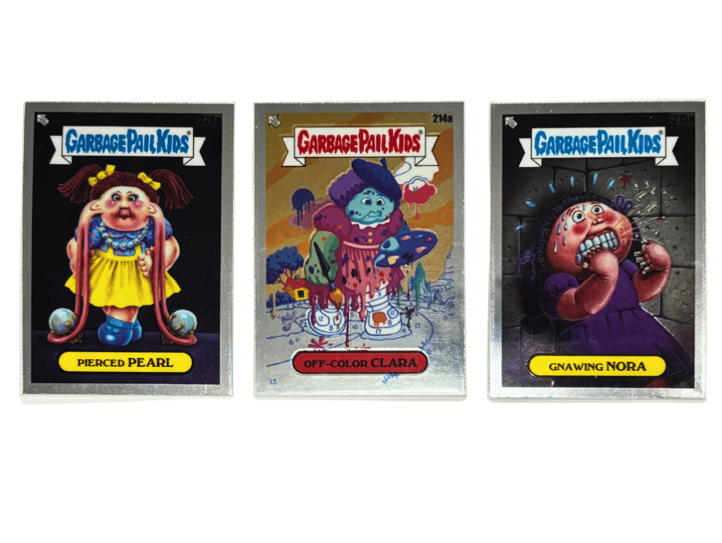 GARBAGE PAIL KIDS CHROME LOT #6 – PIERCED PEARL, OFF-COLOR CLARA, GNAWING NORAThese Cards Scream Chaos! Pierced Pearl Is Overwhelmed By Accessories, Off-Color Clara Returns In Another Vibrant Pose, And Gnawing Nora Goes Full Meltdown. Great Blend Of Classic And Bizarre!- Garbage Pail Kids Chrome Refractor Cards- Cards: 226A Pierced Pearl, 214B Off-Color Clara, 215A Gnawing Nora- Chrome Foil Cards From Topps584901+50