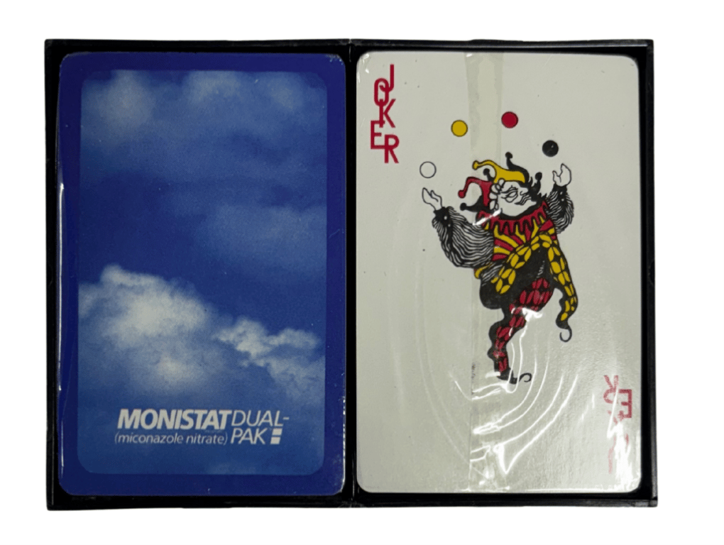 MONISTAT DUAL-PAK PLAYING CARDS – PROMOTIONAL DECKUnusual And Collectible Pharmaceutical Promotional Playing Cards, Featuring The Monistat Dual-Pak Branding On The Reverse And Jester Artwork On The Joker Card. A Quirky Item Great For Offbeat Collectors.- Monistat Promo Item- Full Deck With Branded Card Backs- Joker Card With Juggler Artwork584901+68