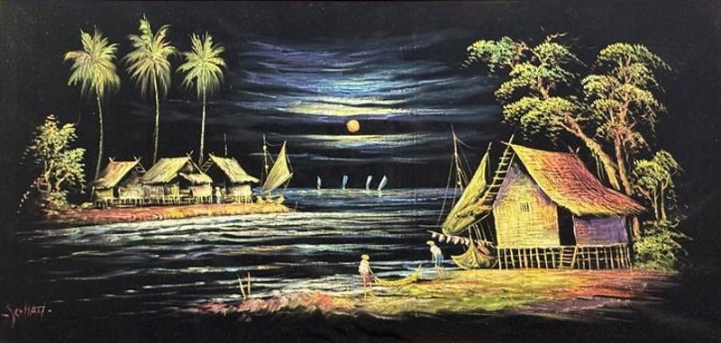 YOHANIAcrylic On Black Velvet (Framed)Title: Balinese Night Seascape With Village Huts And BoatsSignature Details: Signed Lower Left “Yohani”Condition: Fair - Refer To ImagesSr562196+8