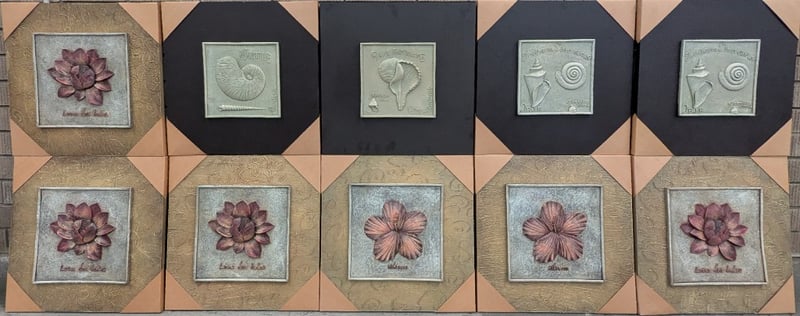 TEN FLOWER AND SHELL THEMED ARTWORKS Artworks On Timber Base, Item Size Approx: 50Cm X 50Cm 584844+5