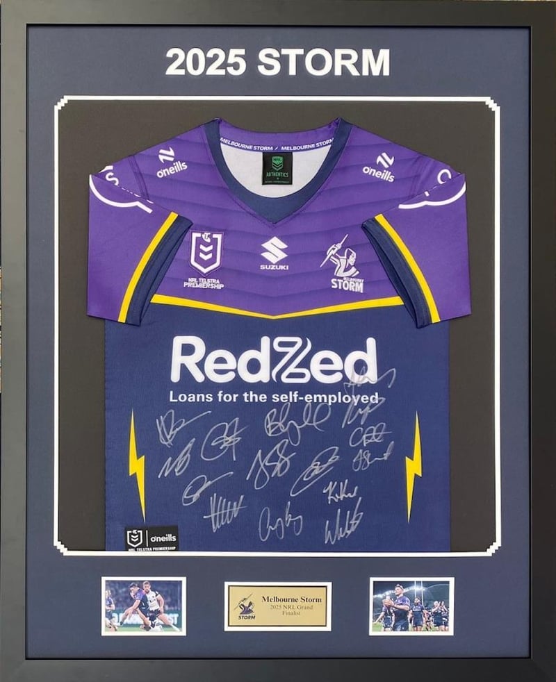 2025 MELBOURNE STORM PERSONALLY SIGNED JERSEY Framed Using Double Mats, 2 Unsigned Photographs And A Plaque. Hand Signed By 15 Members Of The 2025 Melbourne Storm Squad Using A Silver MarkerAccompanied By A Certificate Of AuthenticitySize: 109 X 2 X 89Condition: Good - Refer To Images488295+8