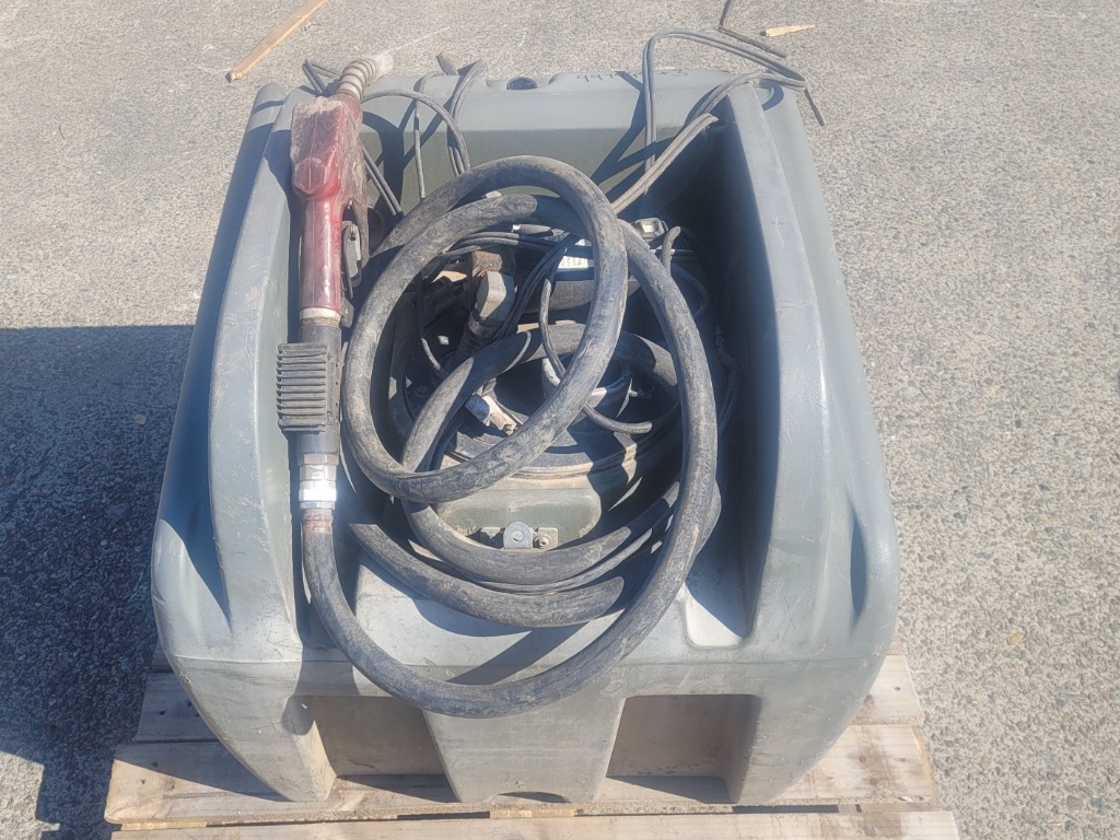 Description: Used fuel pod, with hose and pump handle, approximate dimensions L 850mm x W 700mm x H 760mm.