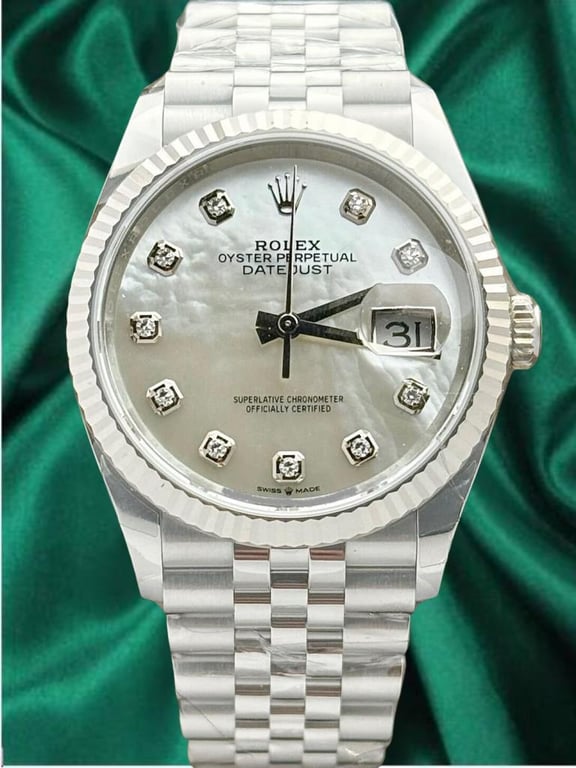 ROLEX DATEJUST 36 MOTHER OF PEARL DIAMOND DIAL JUBILEE 126234 | 2025 | 36MM Price Guide - $26,000 - $30,000 Brand : Rolex Reference : 126234 Model : Datejust 36 Year : 2025 (Unworn) Case Size : 36Mm Power Reserve : 70H Dial : Mother Of Pearl With Diamonds Bezel : White Gold Case : Steel Bracelet : Steel Papers : Yes Box : Yes Condition: Good - Refer Images 0 488240+24