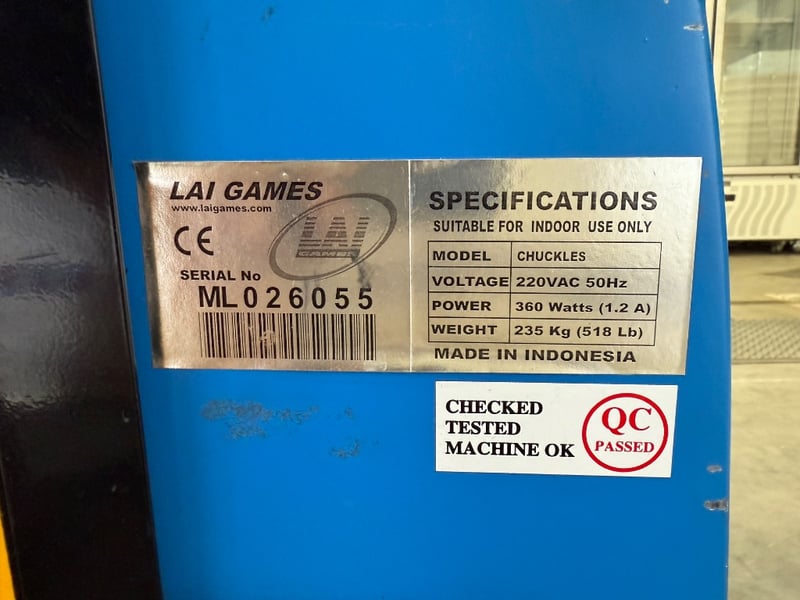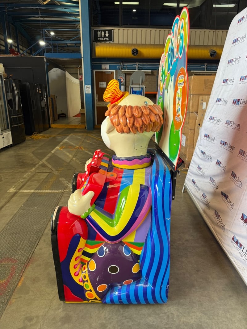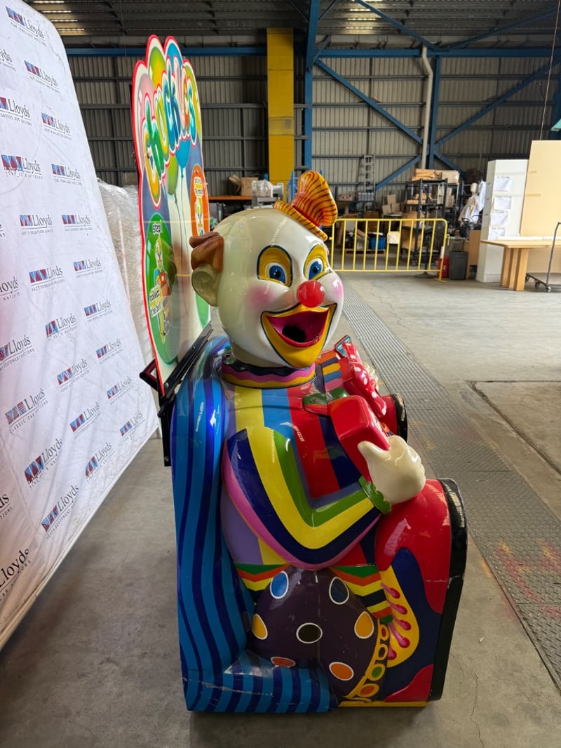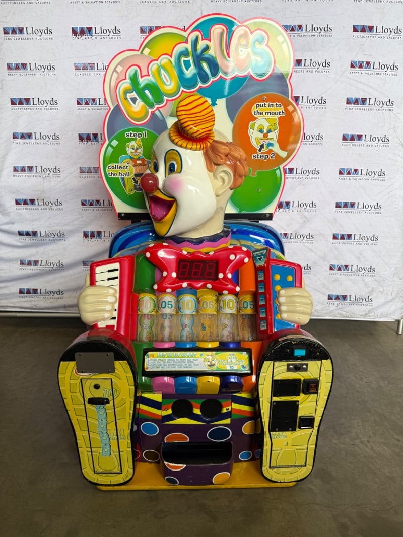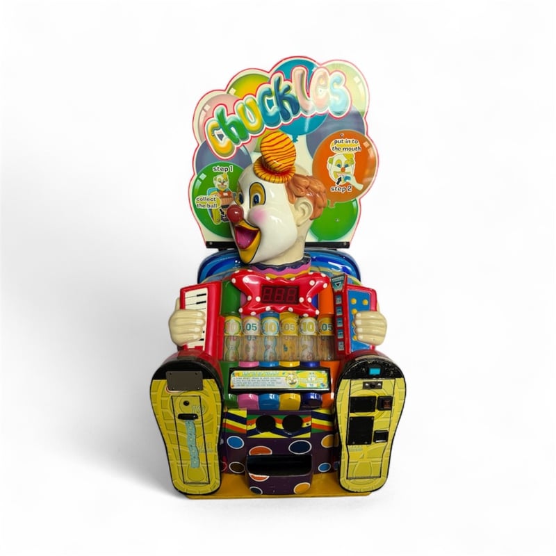 Chuckles The Clown Arcade Circus fun is back with Chuckles the Clown. Children accumulate as many points as possible by feeding the colorful balls to Chuckles while his head rotates side to side. Includes: - Key - Manual NOTE: Scuffs And Marks Visible, machine powers on but unable to verify in full working order. NO POWER CORD