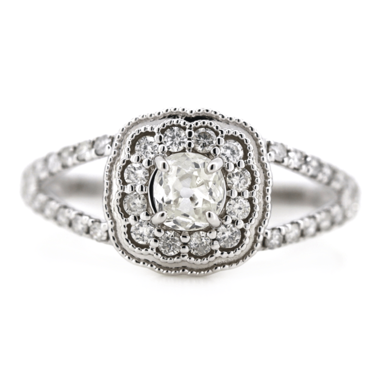 14K WHITE GOLD AND DIAMOND, ART DECO INSPIRED SPLIT BAND RING. 14K White Gold And Diamond, Art Deco Inspired Split Band Ring. The Centre Features, One Old Mine Cut, Diamond (0.34Ct, H-I Colour, Si1-Si2 Clarity), Claw Set. Surrounding The Centre And Decorating The Split Band Are, 40 Round Brilliant Cut, Diamonds (0.47Ct Tdw, H-I Colour, Si1-Si2 Clarity), Pip Set With Millegrain Detail. Ring Size N 1/2. Valuations Provided by an Independent Third-Party Professional Not Directly Associated With Lloyds Auctions at AUD $$10,000.00This valuation has been conducted by an independent third-party professional. The valuation amount is an assessment by the issuing valuer and does not reflect the auction value of the item. Any inquiries regarding the valuation should be directed to the issuing valuer (refer to contact details on the certificate), as Lloyds Auctions has no affiliation or influence over the valuation, the valuer, or the stated amount. Condition: Good - Refer Images 0645823+3272