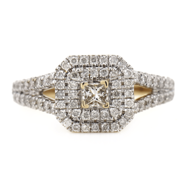 14K YELLOW GOLD AND DIAMOND, DOUBLE HALO SPLIT BAND RING. 14K Yellow Gold And Diamond, Double Halo Split Band Ring. The Centre Features, One Princess Cut, Diamond (0.13Ct, K Colour, Si1 Clarity), 4 Claw Set, Surrounding The Centre In A Double Halo And Decorating The Split Band Are, 100 Round Brilliant Cut, Diamonds (0.58Ct Tdw, H-K Colour, P1+ Clarity), Claw Set. Ring Size M. Valuations Provided by an Independent Third-Party Professional Not Directly Associated With Lloyds Auctions at AUD $$9,900.00This valuation has been conducted by an independent third-party professional. The valuation amount is an assessment by the issuing valuer and does not reflect the auction value of the item. Any inquiries regarding the valuation should be directed to the issuing valuer (refer to contact details on the certificate), as Lloyds Auctions has no affiliation or influence over the valuation, the valuer, or the stated amount. Condition: Good - Refer Images 0645823+3234