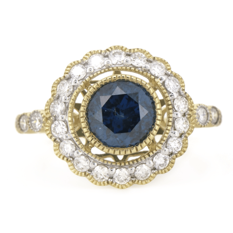 14K YELLOW GOLD, FANCY BLUE DIAMOND, VINTAGE INSPIRED RING. 14K Yellow Gold, Fancy Blue Diamond, Vintage Inspired Ring. The Centre Features, One Round Brilliant Cut, Fancy Deep Blue, Diamond (1.04Ct, Si2 Clarity), Bezel Set. Surrounding The Centre In A Halo And Decorating The Band Are, 22 Round Brilliant Cut, Diamonds (0.50Ct Tdw, G-H Colour, Si2-P1 Clarity), Bead Set With Millegrain Detail. Ring Size M 1/2. Valuations Provided by an Independent Third-Party Professional Not Directly Associated With Lloyds Auctions at AUD $$24,000.00This valuation has been conducted by an independent third-party professional. The valuation amount is an assessment by the issuing valuer and does not reflect the auction value of the item. Any inquiries regarding the valuation should be directed to the issuing valuer (refer to contact details on the certificate), as Lloyds Auctions has no affiliation or influence over the valuation, the valuer, or the stated amount. Condition: Good - Refer Images 0645823+3244