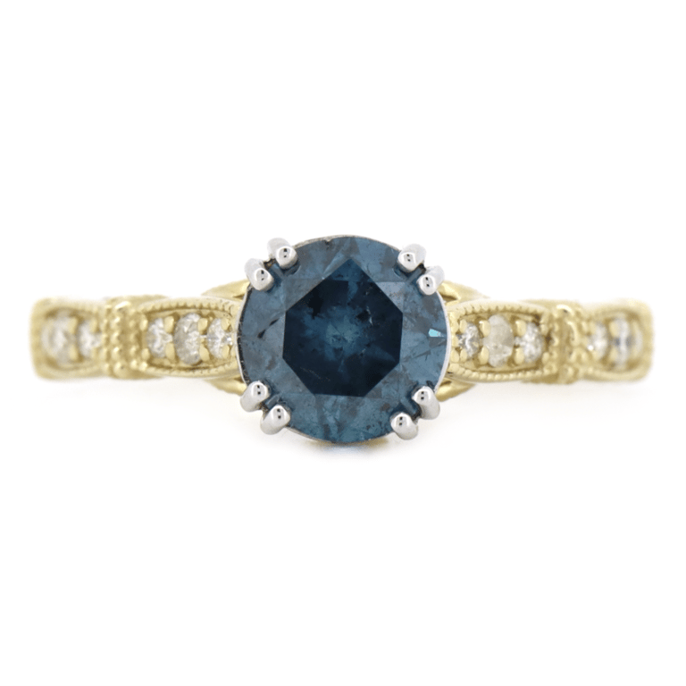 14K YELLOW/WHITE GOLD, BLUE DIAMOND, CLASSIC RING. 14K Yellow/White Gold, Blue Diamond, Classic Ring. The Centre Features, One Round Brilliant Cut, Deep Teal Blue, Diamond (1.34Ct, P2-P3 Clarity), 4 Claw Set. Decorating The Band Are, 14 Round Brilliant Cut, Diamonds (0.20Ct Tdw, H-K Colour, P1+ Clarity), Micro-Bead Set With Millegrain Detail. Ring Size L 1/2. Valuations Provided by an Independent Third-Party Professional Not Directly Associated With Lloyds Auctions at AUD $$17,000.00This valuation has been conducted by an independent third-party professional. The valuation amount is an assessment by the issuing valuer and does not reflect the auction value of the item. Any inquiries regarding the valuation should be directed to the issuing valuer (refer to contact details on the certificate), as Lloyds Auctions has no affiliation or influence over the valuation, the valuer, or the stated amount. Condition: Good - Refer Images 0645823+3262