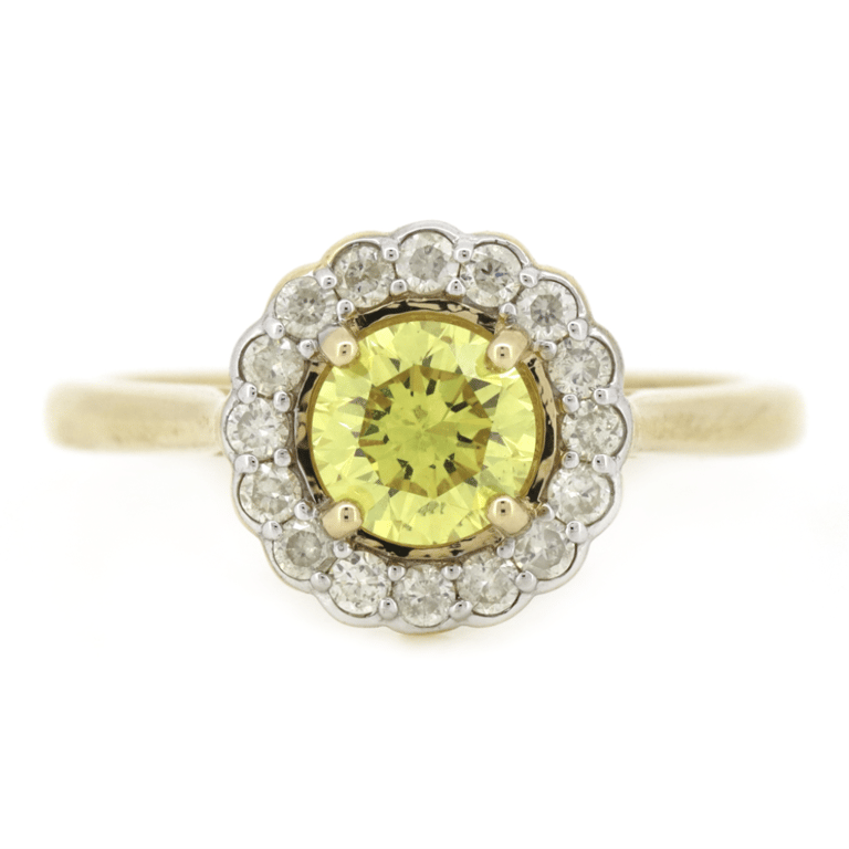 14K YELLOW GOLD, FANCY YELLOW DIAMOND, HALO RING. 14K Yellow Gold, Fancy Yellow Diamond, Halo Ring. The Centre Features, One Round Brilliant Cut, Fancy Vivid Yellow, Diamond (0.69Ct, Colour- Treatment Observed, P1-P2 Clarity), 4 Claw Set. Surrounding The Centre In A Halo Are, 16 Round Brilliant Cut, Diamonds (0.26Ct Tdw, H-K Colour, P2+Clarity), Micro-Bead Set. Ring Size M 1/2. Valuations Provided by an Independent Third-Party Professional Not Directly Associated With Lloyds Auctions at AUD $$12,500.00This valuation has been conducted by an independent third-party professional. The valuation amount is an assessment by the issuing valuer and does not reflect the auction value of the item. Any inquiries regarding the valuation should be directed to the issuing valuer (refer to contact details on the certificate), as Lloyds Auctions has no affiliation or influence over the valuation, the valuer, or the stated amount. Condition: Good - Refer Images 0645823+3227