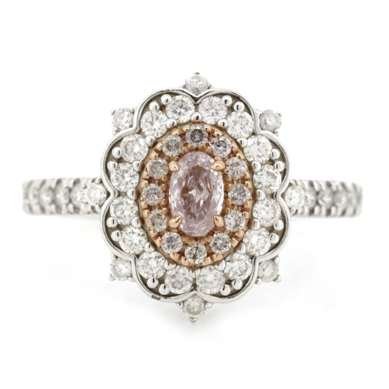 14K WHITE/ROSE GOLD, PINK DIAMOND AND DIAMOND, DOUBLE HALO RING. 14K White/Rose Gold, Pink Diamond And Diamond, Double Halo Ring. The Centre Features, One Oval Modified Brilliant Cut, Fancy Blush Pink, Diamond (0.21Ct, P2+ Clarity, Enhanced), Claw Set In Rose Gold. Decorating The Innermost Halo Are, 12 Round Brilliant Cut, Fancy Blush Pink, Diamonds (0.07Ct Tdw, P2+ Clarity, Enhanced), Bead Set In Rose Gold. Decorating The Outermost Halo And The Band Are, 36 Round Brilliant Cut, Diamond (0.60Ct Tdw, H-K Colour, P2+ Clarity), Bead Set. Ring Size N. Valuations Provided by an Independent Third-Party Professional Not Directly Associated With Lloyds Auctions at AUD $$14,000.00This valuation has been conducted by an independent third-party professional. The valuation amount is an assessment by the issuing valuer and does not reflect the auction value of the item. Any inquiries regarding the valuation should be directed to the issuing valuer (refer to contact details on the certificate), as Lloyds Auctions has no affiliation or influence over the valuation, the valuer, or the stated amount. Condition: Good - Refer Images 0645823+3233