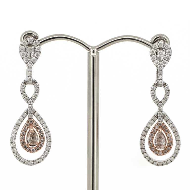 14K WHITE/ROSE GOLD, FANCY PINK DIAMOND, FLOATING DOUBLE HALO DROP EARRINGS. 14K White/Rose Gold, Fancy Pink Diamond, Floating Double Halo Drop Earrings. The Centres Feature, 2 Pear Cut, Fancy Pink, Diamonds (0.23Ct Tdw, Si2-P1 Clarity), 3 Claw Set Rose Gold. Surrounding The Centres In The Inner Halo Are, 32 Round Brilliant Cut, Blush Pink, Diamonds (0.16Ct Tdw, Si2-P1 Clarity), Bead Set In Rose Gold. Surrounding The Inner Halo And Decorating The Drop Design Are, 106 Round Brilliant Cut, Diamonds (0.66Ct Tdw, H-K Colour, P2+ Clarity), Bead Set. The Earrings Have Post Backs, With 14K White Gold Butterfly Clasps. Valuations Provided by an Independent Third-Party Professional Not Directly Associated With Lloyds Auctions at AUD $$17,500.00This valuation has been conducted by an independent third-party professional. The valuation amount is an assessment by the issuing valuer and does not reflect the auction value of the item. Any inquiries regarding the valuation should be directed to the issuing valuer (refer to contact details on the certificate), as Lloyds Auctions has no affiliation or influence over the valuation, the valuer, or the stated amount. Condition: Good - Refer Images 0645823+3226