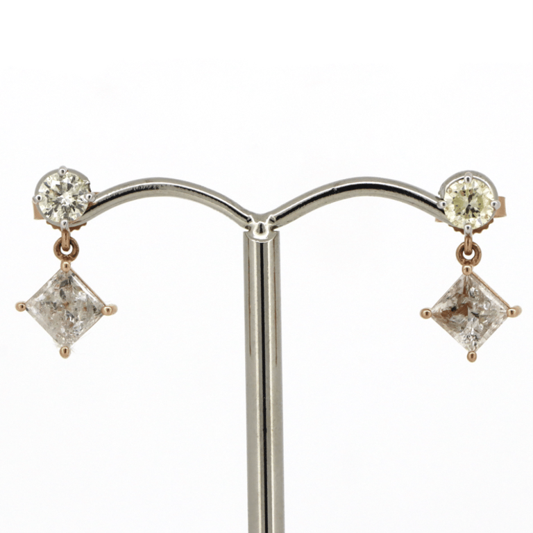 14K ROSE GOLD, CHAMPAGNE DIAMOND, DROP EARRINGS. 14K Rose Gold, Champagne Diamond, Drop Earrings. The Centres Feature, 2 Princess Cut, Champagne, Diamonds (1.95Ct Tdw, P2-P3 Clarity), 4 Claw Set. Embellishing The Studs Are, 2 Round Brilliant Cut, Fancy Yellow, Diamonds (0.34Ct Tdw, Si2-P1 Clarity), Claw Set. The Earrings Have Post Backs With 14K Rose Gold Butterfly Clasps. Valuations Provided by an Independent Third-Party Professional Not Directly Associated With Lloyds Auctions at AUD $$22,250.00This valuation has been conducted by an independent third-party professional. The valuation amount is an assessment by the issuing valuer and does not reflect the auction value of the item. Any inquiries regarding the valuation should be directed to the issuing valuer (refer to contact details on the certificate), as Lloyds Auctions has no affiliation or influence over the valuation, the valuer, or the stated amount. Condition: Good - Refer Images 0645823+3289