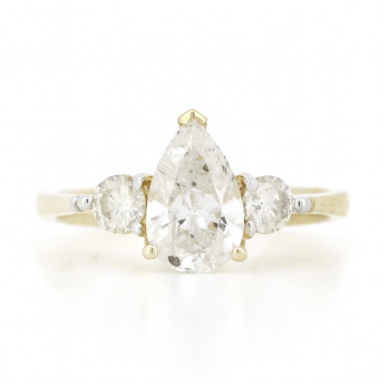 14K YELLOW GOLD AND DIAMOND, TRILOGY STYLE RING. 14K Yellow Gold And Diamond, Trilogy Style Ring. The Centre Features, One Pear Brilliant Cut, Diamond (1.13Ct, G-H Colour, P1-P2 Clarity), Claw Set. Decorating The Accents Are, 2 Round Brilliant Cut, Diamonds (0.28Ct Tdw, H-J Colour, Si2-P1 Clarity), Claw Set. Ring Size J 1/2. Condition: New Valuations Provided by an Independent Third-Party Professional Not Directly Associated With Lloyds Auctions at AUD $$25,580.00This valuation has been conducted by an independent third-party professional. The valuation amount is an assessment by the issuing valuer and does not reflect the auction value of the item. Any inquiries regarding the valuation should be directed to the issuing valuer (refer to contact details on the certificate), as Lloyds Auctions has no affiliation or influence over the valuation, the valuer, or the stated amount. Condition: Good - Refer Images 0645823+3224