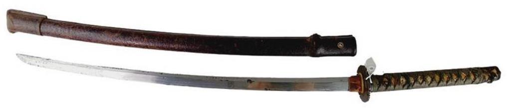 ANTIQUE JAPANESE CIVILIAN SAMURAI SWORDVisible Hamon Along Both Sides And Across The Tip, Visible Grain With Some Lamination Lines, Overall Scratching And Light Pitting, Signed Tang, Copper Habaki, Civilian Mounted Handle With Matching Fuchi Kashira, Menuki Missing, Shukudo Copper Tsuba With A Dragon In The Clouds And Gold Inlay Points, Matches The Handle Fittings Perfectly And Is Tachi Style Fittings, Black Lacquered Scabbard Covered With Leather Combat Cover For Use During WW2 Blade Length: 68.2cm From Tip To NotchItem Size: Height: 98cm, Width: 7cm, Depth: 6cm, Weight: 3Kg#militaria