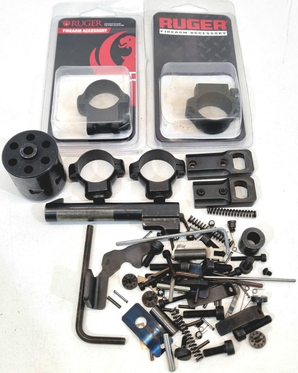 LOT OF ASSORTED FIREARMS ATTACHMENTS Includes Revolver Cylinder, Ruger Scope Rings, Etc Condition: Fair - Refer To Images FC 990516+2