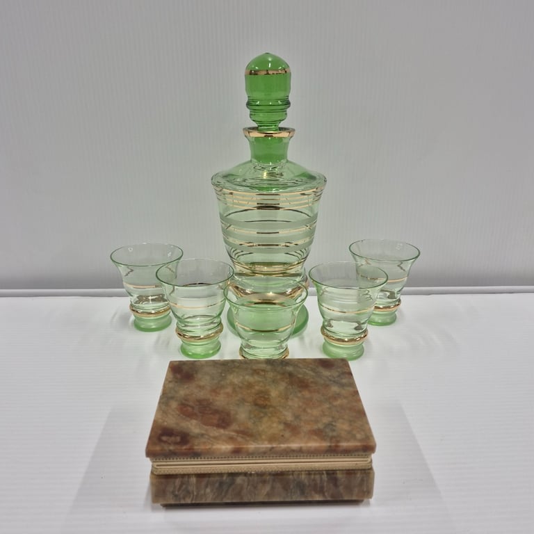 VINTAGE GLASS DECANTER WITH 5 GLASSES I GLASS HAS A CHIP AS IN PHOTO