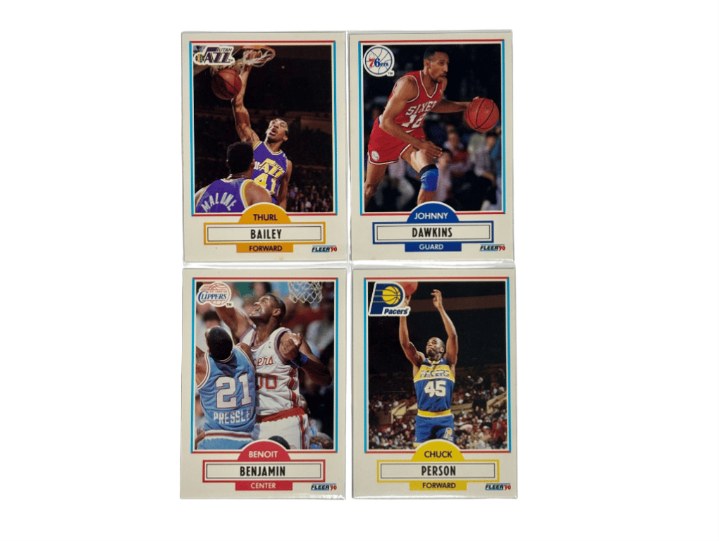 1990 FLEER NBA CARD LOT (X4) – ASSORTED PLAYERSThis 1990 Fleer Basketball Lot Includes Four Players From The Early 90S Era: Thurl Bailey, Johnny Dawkins, Benoit Benjamin, And Chuck Person. Classic White-Border Fleer Design With Action Shots.- 1990 Fleer Nba Cards X4- Players: Bailey, Dawkins, Benjamin, Person- Clean Photography And Stats On Back- Great Binder Fillers Or Starter SetSize: Condition: Good - Refer To Images+40