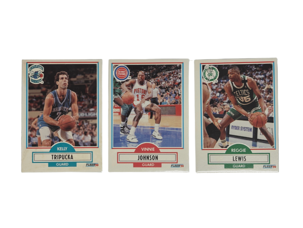1990 FLEER NBA LOT (X3) – TRIPUCKA, JOHNSON, REGGIE LEWISA Clean Trio Of 1990 Fleer Basketball Cards: Kelly Tripucka (Hornets), Vinnie Johnson (Pistons), And Reggie Lewis (Celtics). Simple, Classic Fleer Layout And Team Logos.- 1990 Fleer Basketball X3- Players: Tripucka, Johnson, Lewis- Original 90S Nba AestheticSize: Condition: Good - Refer To Images+50
