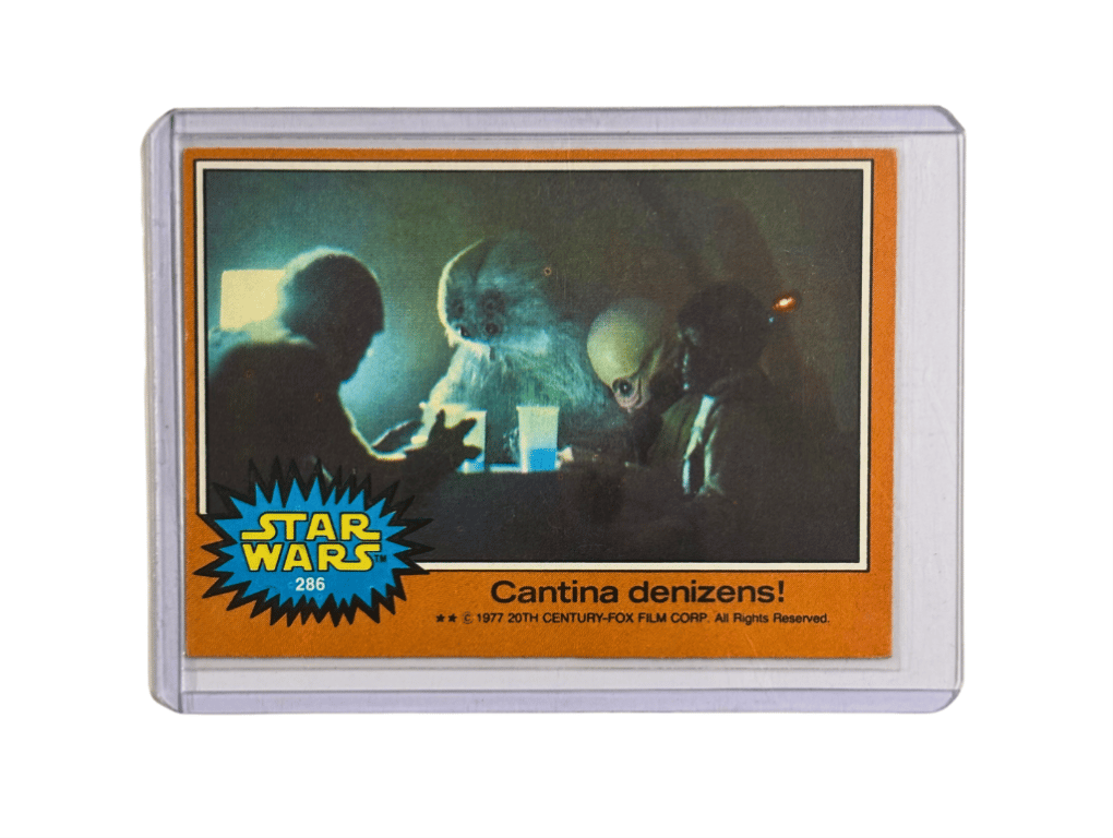 1977 STAR WARS #286 – “CANTINA DENIZENS!” – ORANGE BORDERClassic Scene Card From The 1977 Topps Star Wars Orange-Border Set. Features A Group Of Aliens From The Mos Eisley Cantina, Including The Fuzzy Talz And Bith Musicians.- 1977 Topps Star Wars Card #286- Orange Border Series- Scene: Creatures From The Famous Cantina SequenceSize: Condition: Good - Refer To Images+65