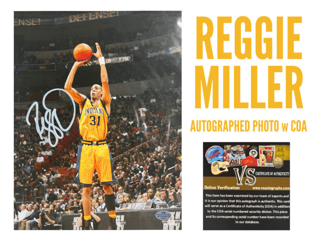 REGGIE MILLER AUTOGRAPHED INDIANA PACERS PHOTO (W/ COA)Legendary Sharpshooter Reggie Miller Is Captured In Action In This Signed 8X10 Photo. A Must-Have For Nba Collectors, Authenticated By Vs Autographs With Matching Sticker And Online Verifiable Coa.- Authentic Reggie Miller Signature- 8X10 Action Photo In Pacers Uniform- Includes Vs Autographs Coa & SerialSize: Condition: Good - Refer To Images+3