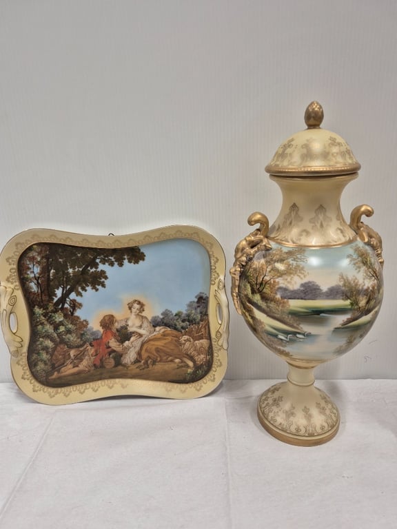 TWO DECORATIVE VINTAGE TRAY AND URN