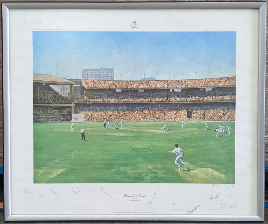 ALAN FEARNLEY (1942 - )Signed Limited Edition Lithograph On PaperTitle: Melbourne Cricket GroundsImage Size: 44cm x 58cmFrame Size: 63cm x 75cmEdition: 244/850Signature Details: Signed Lower ArtworkCondition: Good - Refer To ImagesArtwork Signed By Artist And 1977 Centenary Test Team584905+12