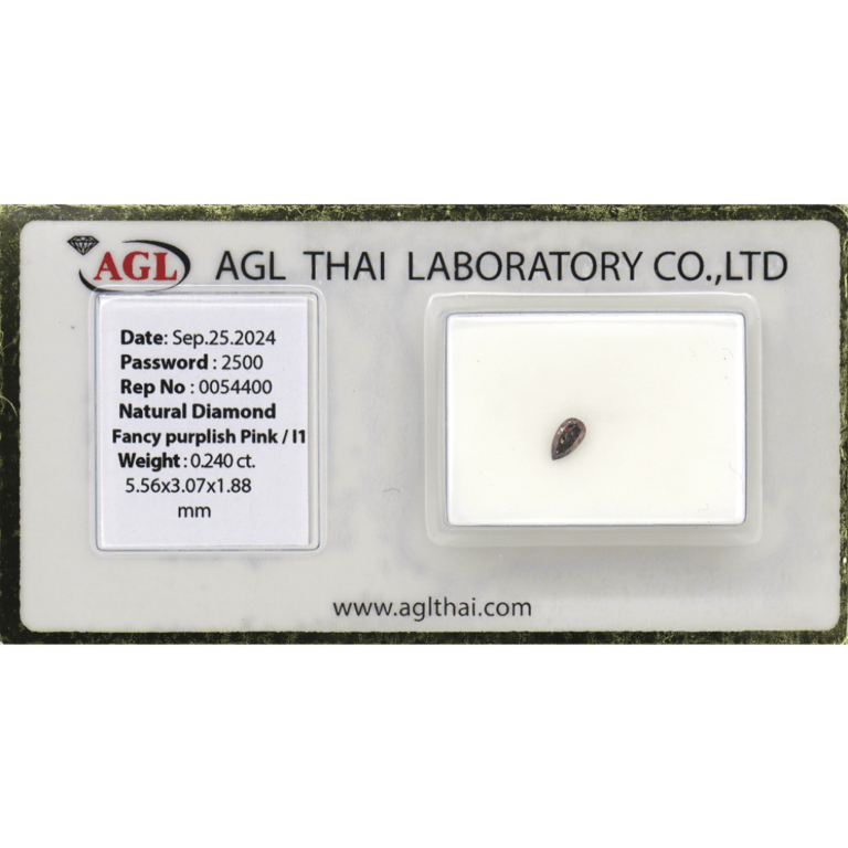 0.24CT CERTIFIED, NATURAL FANCY PURPLE/PINK DIAMOND. Pear Brilliant Cut, Fancy Purplish-Pink Colour, I1 Clarity, Loose, Unset. Stone Comes Sealed With Agl Report: 0054400. Valuations Provided by an Independent Third-Party Professional Not Directly Associated With Lloyds Auctions at AUD $$16,700.00This valuation has been conducted by an independent third-party professional. The valuation amount is an assessment by the issuing valuer and does not reflect the auction value of the item. Any inquiries regarding the valuation should be directed to the issuing valuer (refer to contact details on the certificate), as Lloyds Auctions has no affiliation or influence over the valuation, the valuer, or the stated amount. Condition: Good - Refer Images 0645829+3383
