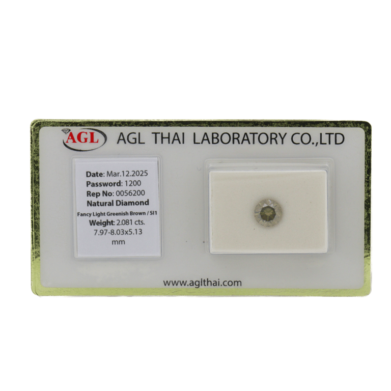2.081CT CERTIFIED, NATURAL GREEN/BROWN DIAMOND. Round Brilliant Cut, Fancy Light Greenish-Brown Colour, Si1 Clarity, Loose, Unset. Stone Comes Sealed With Agl Report: 0056200. Valuations Provided by an Independent Third-Party Professional Not Directly Associated With Lloyds Auctions at AUD $$16,500.00This valuation has been conducted by an independent third-party professional. The valuation amount is an assessment by the issuing valuer and does not reflect the auction value of the item. Any inquiries regarding the valuation should be directed to the issuing valuer (refer to contact details on the certificate), as Lloyds Auctions has no affiliation or influence over the valuation, the valuer, or the stated amount. Condition: Good - Refer Images 0645829+3387