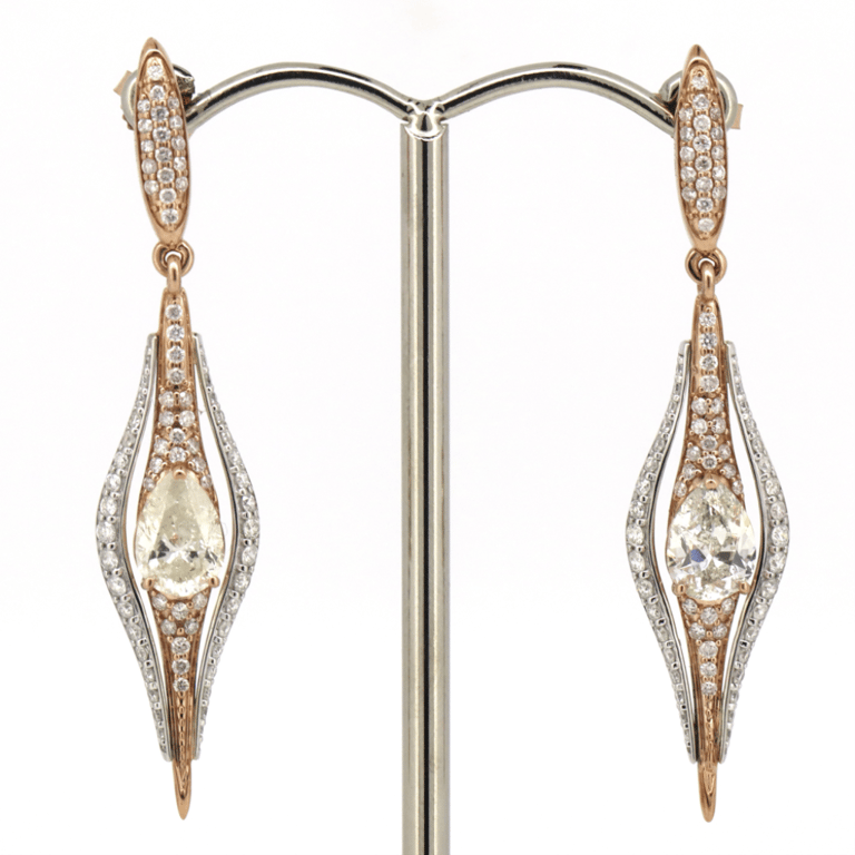 14K ROSE/WHITE GOLD AND DIAMOND, DROP EARRINGS. The Earrings Feature, 2 Pear Brilliant Cut, Diamonds (2.01Ct Tdw, K-L Colour, I1-2 Clarity), 4 Claw Set. Accompanying The Centre In A Fancy Drop Are, 152 Round Brilliant Cut, Diamonds (1.00Ct Tdw, G-J Colour, Si-I2 Clarity), Bead Set. The Earrings Have Post Backs With 14K Rose Gold Butterflies. Valuations Provided by an Independent Third-Party Professional Not Directly Associated With Lloyds Auctions at AUD $$46,300.00This valuation has been conducted by an independent third-party professional. The valuation amount is an assessment by the issuing valuer and does not reflect the auction value of the item. Any inquiries regarding the valuation should be directed to the issuing valuer (refer to contact details on the certificate), as Lloyds Auctions has no affiliation or influence over the valuation, the valuer, or the stated amount. Condition: Good - Refer Images 0645829+3303