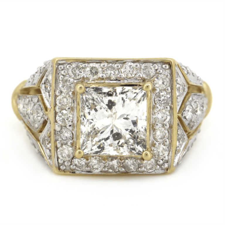14K YELLOW GOLD, CHAMPAGNE DIAMOND AND DIAMOND, COCKTAIL RING. The Centre Features, One Princess Cut, Fancy Champagne, Diamond (2.03Ct, H-K Colour, P1 Clarity), 4 Claw Set. Encompassing The Centre And Decorating The Band Are, 48 Round Brilliant Cut, Diamonds (0.90Ct Tdw, H-K Colour, P2+ Clarity), Bead Set. Ring Size M. Valuations Provided by an Independent Third-Party Professional Not Directly Associated With Lloyds Auctions at AUD $$57,600.00This valuation has been conducted by an independent third-party professional. The valuation amount is an assessment by the issuing valuer and does not reflect the auction value of the item. Any inquiries regarding the valuation should be directed to the issuing valuer (refer to contact details on the certificate), as Lloyds Auctions has no affiliation or influence over the valuation, the valuer, or the stated amount. Condition: Good - Refer Images 0645829+3386