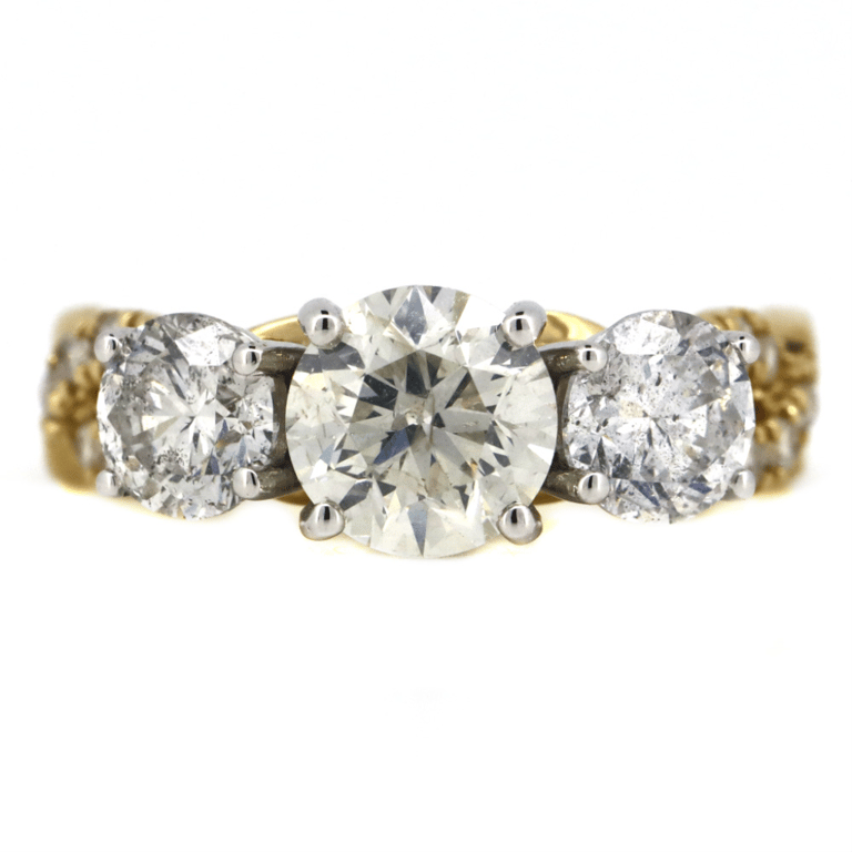 14K YELLOW/WHITE GOLD AND DIAMOND, TRILOGY RING. The Design Features, 3 Round Brilliant Cut, Diamonds (2.83Ct Tdw, H-I Colour, P1-P2 Clarity), Basket Claw Set. Accompanying The Design Are, 16 Round Brilliant Cut, Diamonds (0.25Ct Tdw, H-I Colour, P1-P2 Clarity), Bead Set. Ring Size N 1/2. Valuations Provided by an Independent Third-Party Professional Not Directly Associated With Lloyds Auctions at AUD $$62,000.00This valuation has been conducted by an independent third-party professional. The valuation amount is an assessment by the issuing valuer and does not reflect the auction value of the item. Any inquiries regarding the valuation should be directed to the issuing valuer (refer to contact details on the certificate), as Lloyds Auctions has no affiliation or influence over the valuation, the valuer, or the stated amount. Condition: Good - Refer Images 0645829+3342
