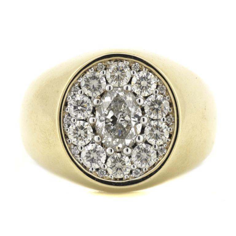 14K YELLOW GOLD AND DIAMOND, GENTS CLUSTER RING. The Centre Features, One Oval Brilliant Cut, Diamond (1.00Ct, G-H Colour, Vs1-Si1 Clarity), 10-Claw Set. Encompassing The Centre Are, 20 Round Brilliant Cut, Diamonds (0.99Ct Tdw, G-H Colour, Si1-Si2 Clarity), Micro-Bead Set. Ring Size T 1/2. Valuations Provided by an Independent Third-Party Professional Not Directly Associated With Lloyds Auctions at AUD $$25,000.00This valuation has been conducted by an independent third-party professional. The valuation amount is an assessment by the issuing valuer and does not reflect the auction value of the item. Any inquiries regarding the valuation should be directed to the issuing valuer (refer to contact details on the certificate), as Lloyds Auctions has no affiliation or influence over the valuation, the valuer, or the stated amount. Condition: Good - Refer Images 0645829+3377