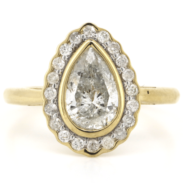 The Centre Features, One Pear Modified Brilliant Cut, Diamond (1.53Ct, K-L (Off-White) Colour, Si2-P1 Clarity), Bezel Set. Surrounding The Centre In A Halo Are, 20 Round Brilliant Cut, Diamonds (0.30Ct Tdw, G-H Colour, Si1-Si2 Clarity), Bead Set. Ring Size O 1/2.