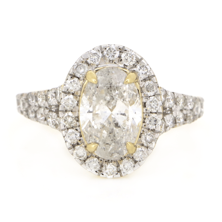14K YELLOW GOLD AND DIAMOND, HALO SPLIT BAND RING. The Centre Features, One Oval Cut, Diamond (1.52Ct, H Colour, I1 Clarity), 4 Claw Set. Surrounding The Centre In A Halo And Decorating The Band Are, 38 Round Brilliant Cut, Diamonds (0.71Ct Tdw, H Colour, Si-I2 Clarity), Claw Set. Ring Size N. Valuations Provided by an Independent Third-Party Professional Not Directly Associated With Lloyds Auctions at AUD $$32,900.00This valuation has been conducted by an independent third-party professional. The valuation amount is an assessment by the issuing valuer and does not reflect the auction value of the item. Any inquiries regarding the valuation should be directed to the issuing valuer (refer to contact details on the certificate), as Lloyds Auctions has no affiliation or influence over the valuation, the valuer, or the stated amount. Condition: Good - Refer Images 0645829+3313