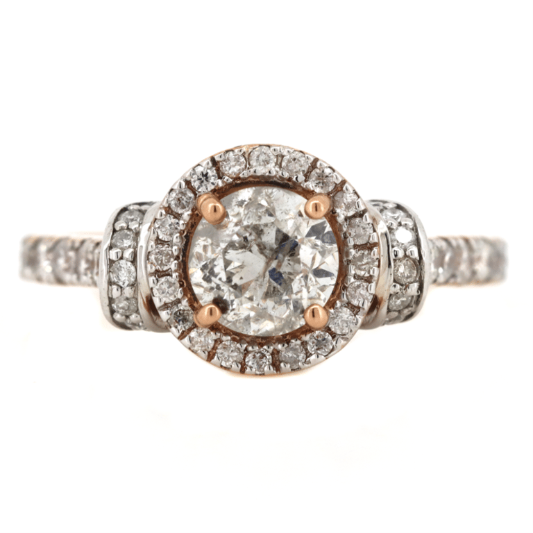 14K ROSE GOLD AND DIAMOND, DRESS RING. The Centre Features, One Round Brilliant Cut, Diamond (1.18Ct Tdw, J Colour, P2 Clarity), 4 Claw Set. Surrounding The Centre In A Halo And Decorating The Setting/Band Are, 54 Round Brilliant Cut, Diamonds (0.37Ct Tdw, H-K Colour, P1+ Clarity), Bead/Claw/Punch Set. Ring Size N. Valuations Provided by an Independent Third-Party Professional Not Directly Associated With Lloyds Auctions at AUD $$22,000.00This valuation has been conducted by an independent third-party professional. The valuation amount is an assessment by the issuing valuer and does not reflect the auction value of the item. Any inquiries regarding the valuation should be directed to the issuing valuer (refer to contact details on the certificate), as Lloyds Auctions has no affiliation or influence over the valuation, the valuer, or the stated amount. Condition: Good - Refer Images 0645829+3345