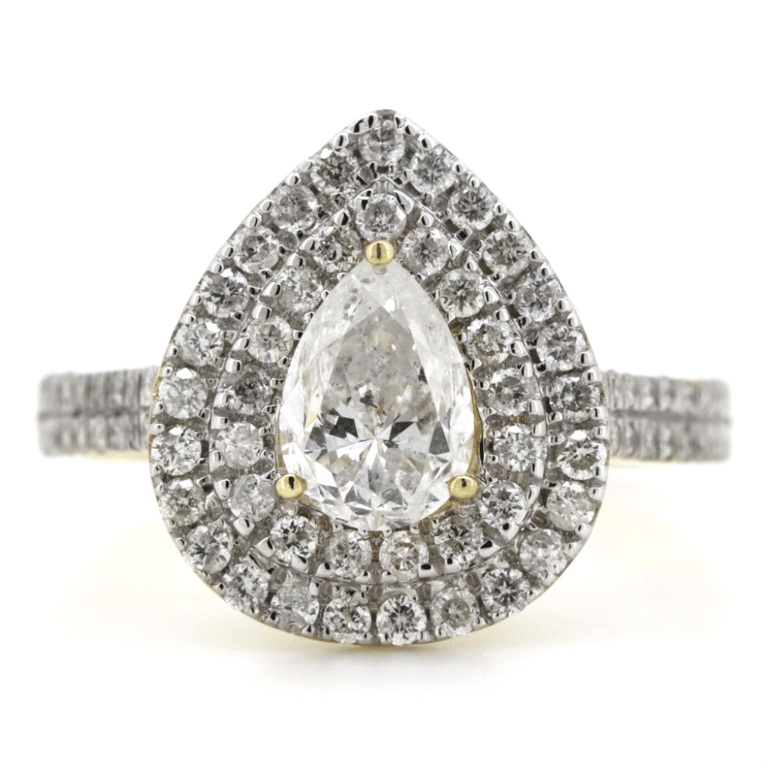 14K YELLOW GOLD AND DIAMOND, DOUBLE HALO RING. The Centre Features, One Pear Faceted Cut, Diamond (1.01Ct, J Colour, P2+ Clarity), 3 Claw Set. Surrounding The Centre In A Double Halo And Decorating The Band Are, 78 Round Brilliant Cut, Diamonds (0.59Ct Tdw, H-K Colour, P2+ Clarity), Micro Bead Set. Ring Size N. Valuations Provided by an Independent Third-Party Professional Not Directly Associated With Lloyds Auctions at AUD $$15,500.00This valuation has been conducted by an independent third-party professional. The valuation amount is an assessment by the issuing valuer and does not reflect the auction value of the item. Any inquiries regarding the valuation should be directed to the issuing valuer (refer to contact details on the certificate), as Lloyds Auctions has no affiliation or influence over the valuation, the valuer, or the stated amount. Condition: Good - Refer Images 0645829+3306