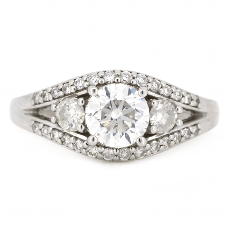 14K WHITE GOLD AND DIAMOND, TRILOGY DRESS RING. The Centre Features, One Round Brilliant Cut, Diamond (0.93Ct, H-I Colour, P1-P2 Clarity), Claw Set. Flanking Either Side And Bordering The Centre Are, 30 Round Brilliant Cut, Diamonds (0.42Ct Tdw, G-H Colour, Si2-P1 Clarity), Claw/Bead Set. Ring Size L 1/2. Valuations Provided by an Independent Third-Party Professional Not Directly Associated With Lloyds Auctions at AUD $$30,000.00This valuation has been conducted by an independent third-party professional. The valuation amount is an assessment by the issuing valuer and does not reflect the auction value of the item. Any inquiries regarding the valuation should be directed to the issuing valuer (refer to contact details on the certificate), as Lloyds Auctions has no affiliation or influence over the valuation, the valuer, or the stated amount. Condition: Good - Refer Images 0645829+3334