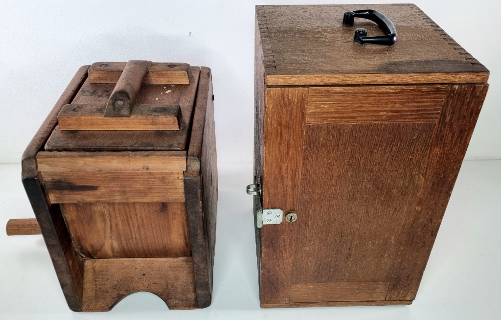 VINTAGE THEODOLITE WITH WOODEN CASE AND VINTAGE BUTTER CHURN