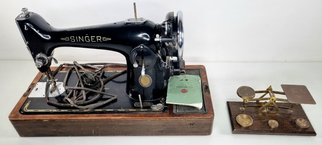 VINTAGE SINGER SEWING MACHINE AND GOLD SCALES
