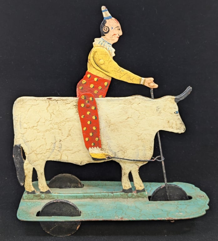 VINTAGE TIN TOY RODEO CLOWN ON A BULL