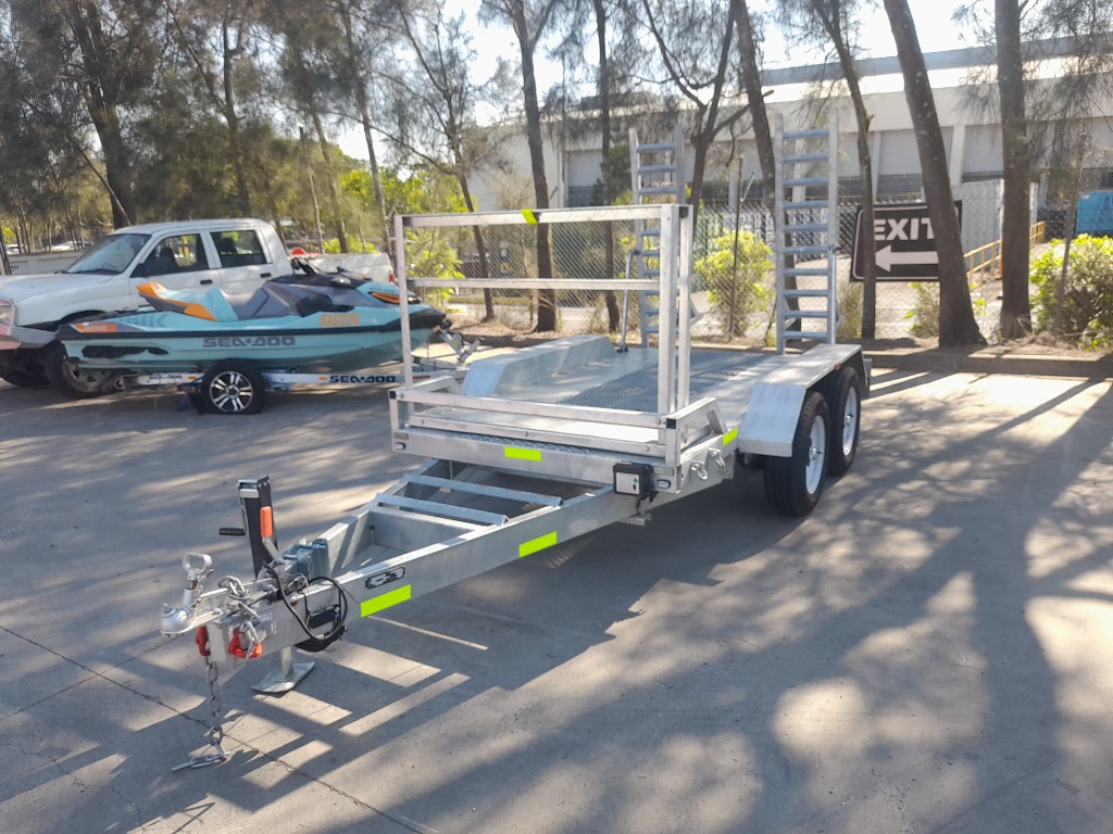 Description: Galvanised trailer, min digger hauler, comes with dove tail ramps, twin axle, break away system, Jockey wheel, 7 pin flat lead