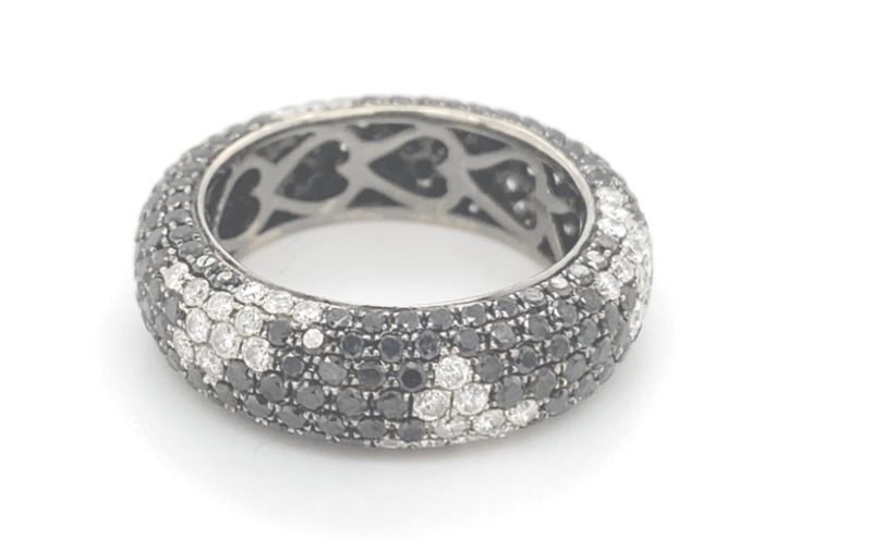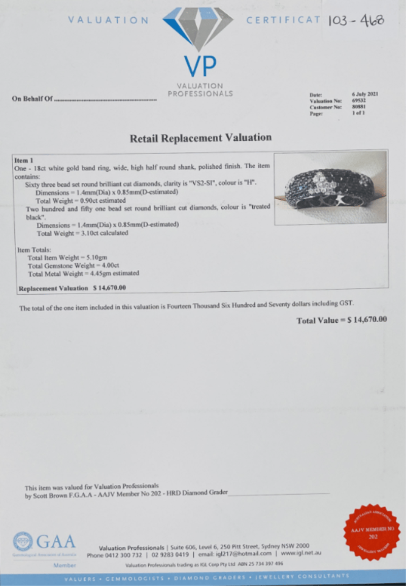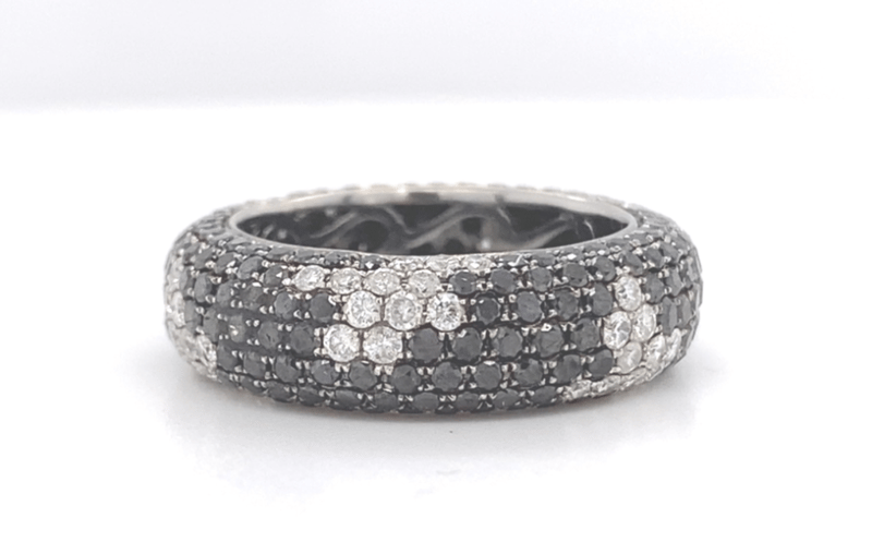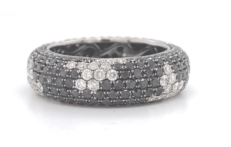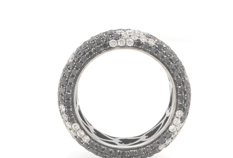 An 18Ct White Gold Band Ring Featuring A Wide, High Half-Round Shank And Polished Finish. The Design Is Bead Set With 63 Round Brilliant Cut White Diamonds (Vs2–Si1 Clarity, H Colour) Totalling 0.90Ct, And 250 Treated Black Round Brilliant Cut Diamonds Totalling 3.10Ct. Professionally Appraised With A Retail Replacement Valuation Of A$14,670 By Valuation Professionals.