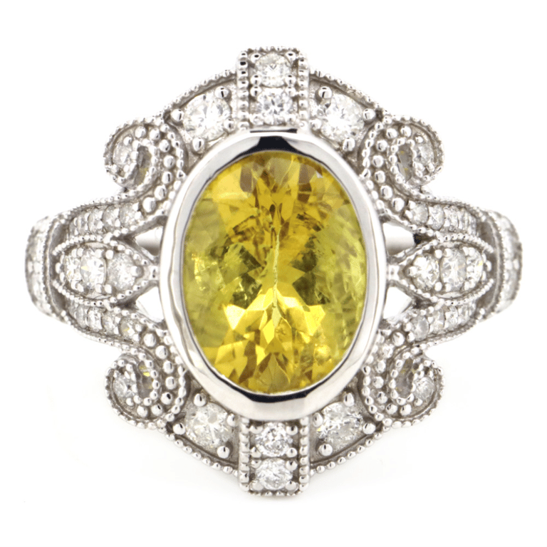 14K WHITE GOLD, GOLDEN BERYL AND DIAMOND, ANTIQUE INSPIRED RING.