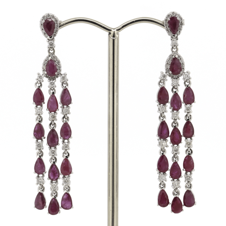 14K WHITE GOLD, RUBY AND DIAMOND, CHANDELIER EARRINGS.