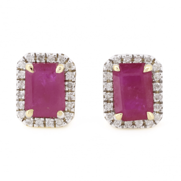 The Centres Feature, 2 Emerald Cut, Pinkish-Red, Rubies (1.71Ct Tsw, Included, Enhanced), 4 Claw Set. Surrounding The Centres In Halos Are, 40 Round Brilliant Cut, Diamonds (0.17Ct Tdw, I-K Colour, P1-P2 Clarity), Claw Set. The Earrings Have Post Backs, With 14K Yellow Gold Butterfly Clasps.