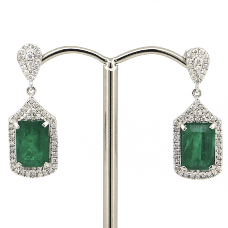14K WHITE GOLD, 4.08CT ZAMBIAN EMERALD AND DIAMOND, DROP EARRINGS. The Drops Feature, 2 Emerald Cut, Deep Bluish-Green, Emeralds (4.08Ct Tsw, Heavily Included), 4 Claw Set. Encompassing The Design Are, 116 Round Brilliant Cut, Diamonds (0.61Ct Tdw, G-H Colour, Si1-Si2 Clarity), Micro-Claw Set In White Gold. The Earrings Have Post Backs, With 14K White Gold Butterfly Clasps. Valuations Provided by an Independent Third-Party Professional Not Directly Associated With Lloyds Auctions at AUD $$22,000.00This valuation has been conducted by an independent third-party professional. The valuation amount is an assessment by the issuing valuer and does not reflect the auction value of the item. Any inquiries regarding the valuation should be directed to the issuing valuer (refer to contact details on the certificate), as Lloyds Auctions has no affiliation or influence over the valuation, the valuer, or the stated amount. Condition: Good - Refer Images 0645833+1310