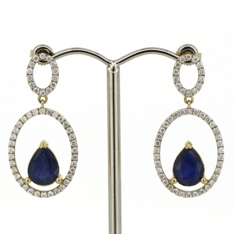 14K YELLOW GOLD, BLUE SAPPHIRE AND DIAMOND, DOUBLE HOOP DROP EARRINGS. The Design Features, 2 Pear Cut, Medium Dark Royal Blue, Sapphires (3.71Ct Tsw, Eye Visible Inclusions), 3 Claw Set. Decorating The Design In Double Oval Hoops Are, 96 Round Brilliant Cut, Diamonds (0.94Ct Tdw, J-K Colour, Si2-I2 Clarity), Claw Set. The Earrings Have Post Backs, With 14K Yellow Gold Butterfly Clasps. Valuations Provided by an Independent Third-Party Professional Not Directly Associated With Lloyds Auctions at AUD $$11,590.00This valuation has been conducted by an independent third-party professional. The valuation amount is an assessment by the issuing valuer and does not reflect the auction value of the item. Any inquiries regarding the valuation should be directed to the issuing valuer (refer to contact details on the certificate), as Lloyds Auctions has no affiliation or influence over the valuation, the valuer, or the stated amount. Condition: Good - Refer Images 0645833+1348