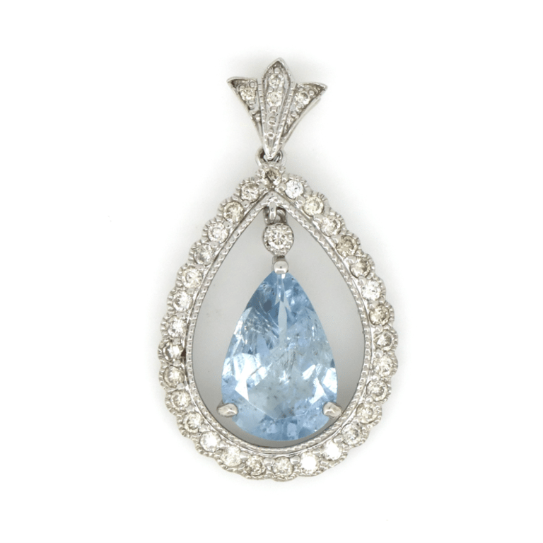 The Centre Features, One Pear Cut, Light Greyish-Blue, Aquamarine (1.97Ct, Eye Visible Inclusions), 3 Claw Set. Surrounding The Centre In A Halo And Decorating The Bail Are, 36 Round Brilliant Cut, Diamonds (0.38Ct Tdw, J-K Colour, Si2-I2 Clarity), Bead Set In White Gold.