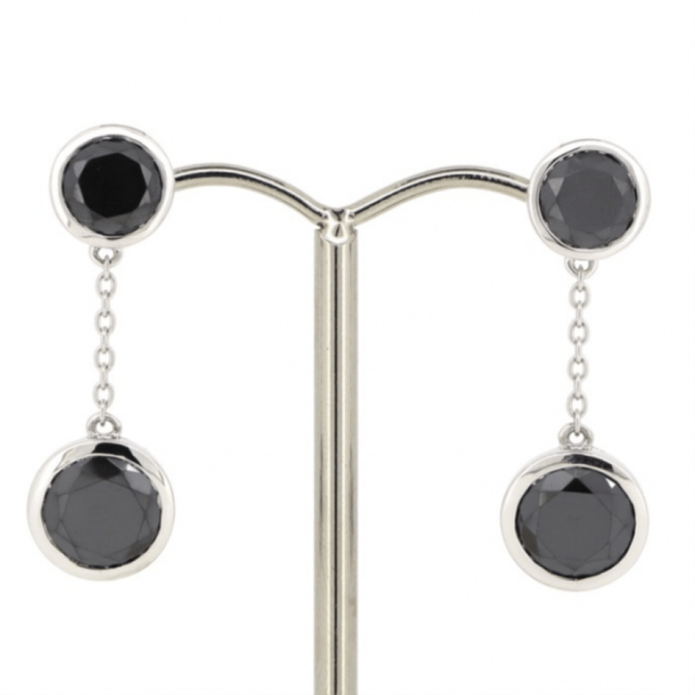 14K WHITE GOLD, BLACK MOISSANITE, CHAIN DROP EARRINGS.