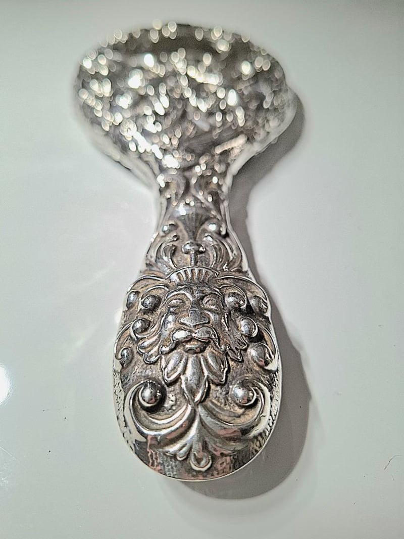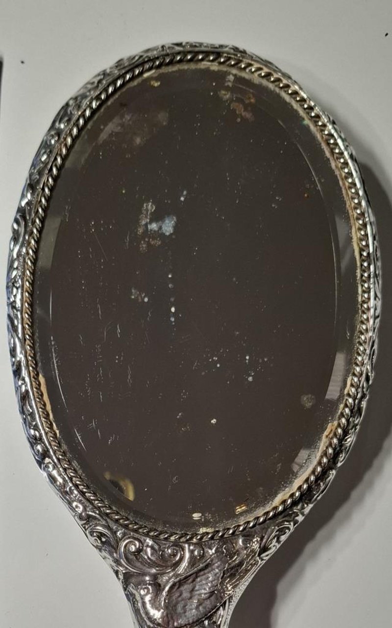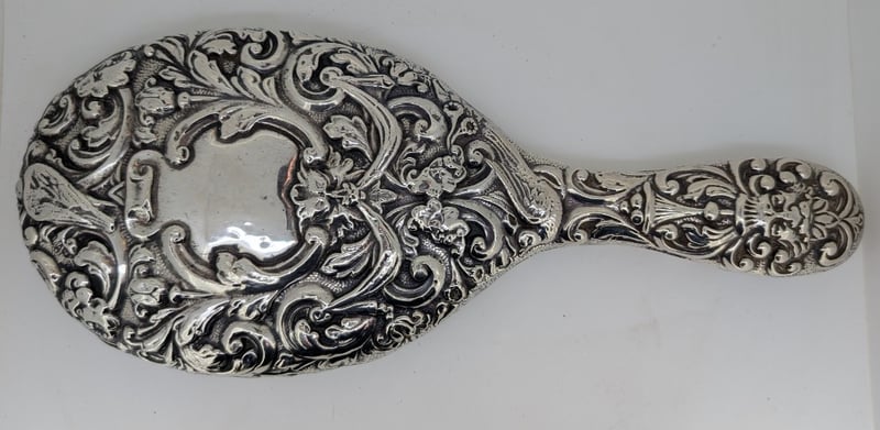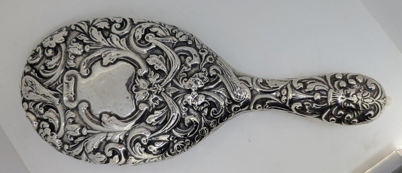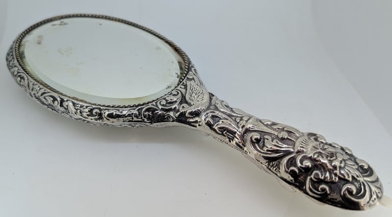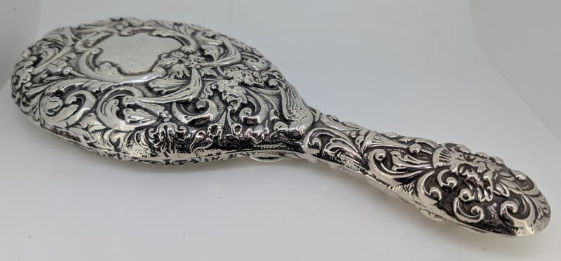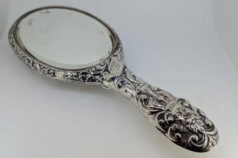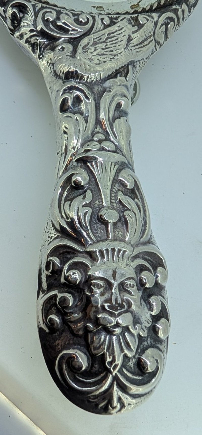 Sterling silver hand mirror with intricate silver work, depicting faces of figures, and hallmark stamps. Made in England, 1903.